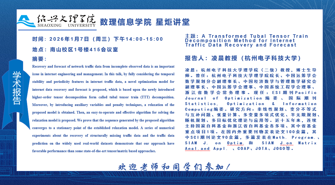 杭州电子科技大学 凌晨教授:A Transformed Tubal Tensor Train Decomposition Method for Internet Traffic Data Recovery and Forecast