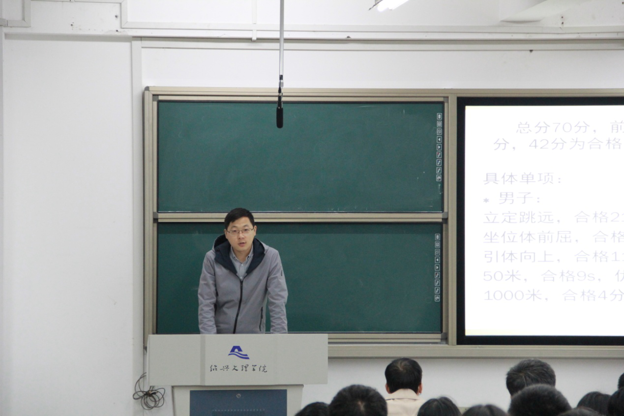 首先,李权玺老师表示我院很荣幸能作为绍兴文理学院代表接受省教育厅的体质抽测,并指出今年的抽测成绩将是明年申请绍兴大学的一项重要考核指标。之后,李老师分别从测试时间、测试项目、评分标准三方面详细介绍了校体测和省教育厅抽测的具体情况,提醒各班再次组织身体状态排查,并具体说明了免测手续办理流程。他强调体质测试不仅是个人的事,同时也是代表学校,希望同学们在思想上高度重视,抓住宝贵机会锻炼自己、提升体能。