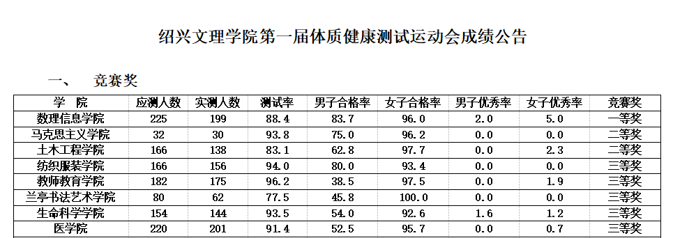 绍兴文理学院第一届体质健康测试运动会圆满落下帷幕,我院在此次体质健康测试运动会中荣获一等奖,其中男子合格率为83.7,女子合格率为96.0;男子优秀率为2.0,女子优秀率为5.0。