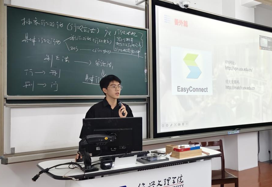 然后分享的是来自应用统计学231班俞炬枫学长,他以笔耕不辍,拾级而上的心态展开了对于大学规划的叙述。通过他的分享,我们了解到了许多竞赛的知识与各种精彩的社团活动,最后他让我们怀着期待去面对未知,给予我们极大的鼓励。