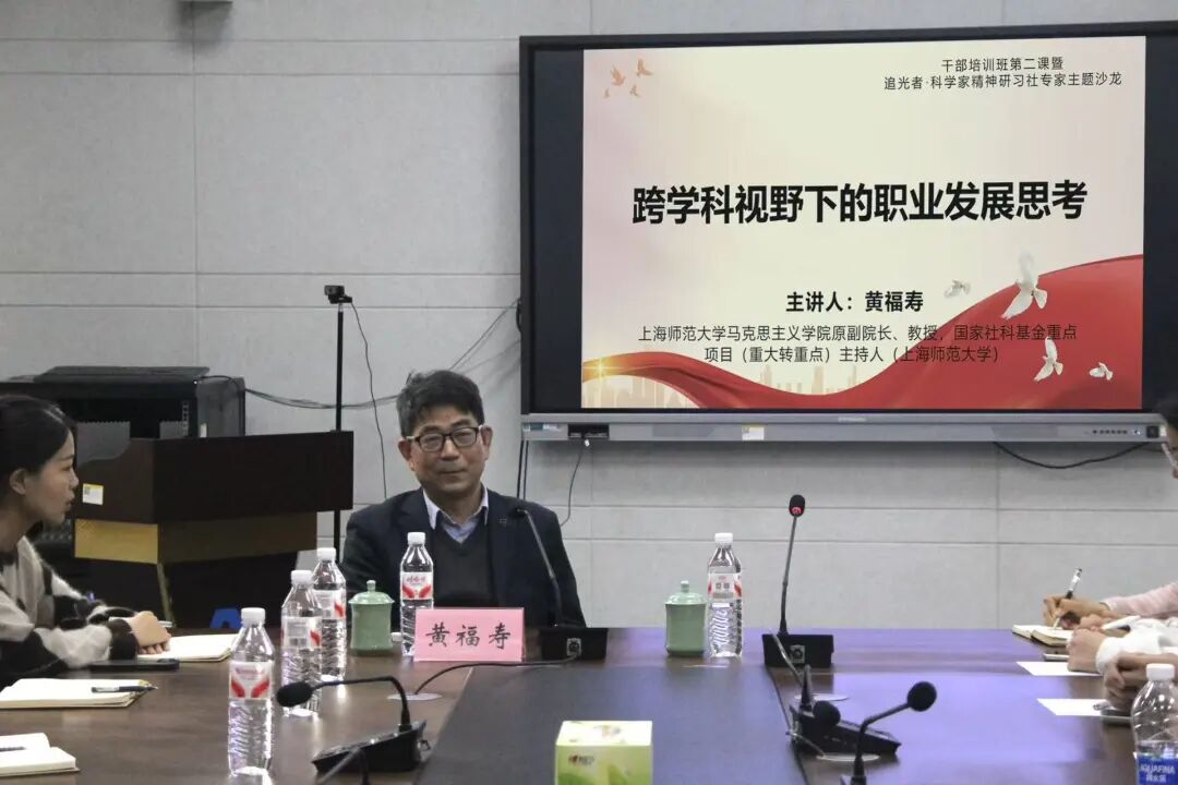 2026年4月7日下午3:30,我院学生干部培训班第二课暨追光者· 科学家精神研习社沙龙在南山一号楼415会议室成功开展。本期主题为跨学科视野领航职业发展,主讲人为上海师范大学马克思主义学院原副院长,国家社科基金重点项目主持人黄福寿教授,数理信息学院学院党委副书记、纪委书记金灵老师,学生科副科长杜美霞老师,分团委书记陈仔超老师,辅导员韩子溢老师出席本次活动,学院学生会干部及相关社团负责人参训学习。